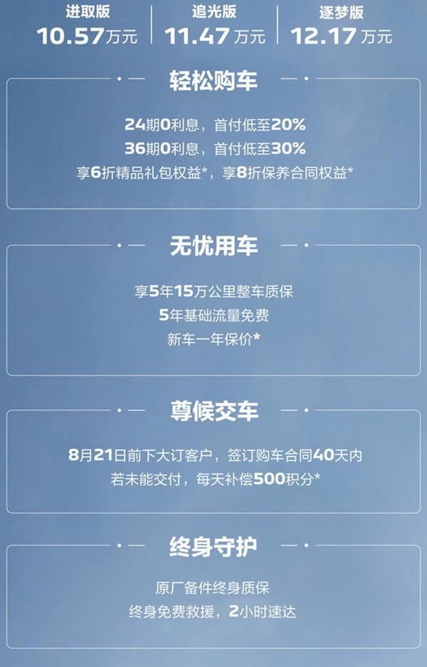 此外,新車還提供了多重購車權益,例如輕松購車、無憂用車、尊候交車、終身守護等。其中包括24期0利率、低至20%;36期0利率,低至30%,6折精品禮包權益,8折保養(yǎng)合同權益、5年15萬公里整車質保、5年免費基礎流量、新車一年保價、原廠備件終身質保、終身免費救援等。