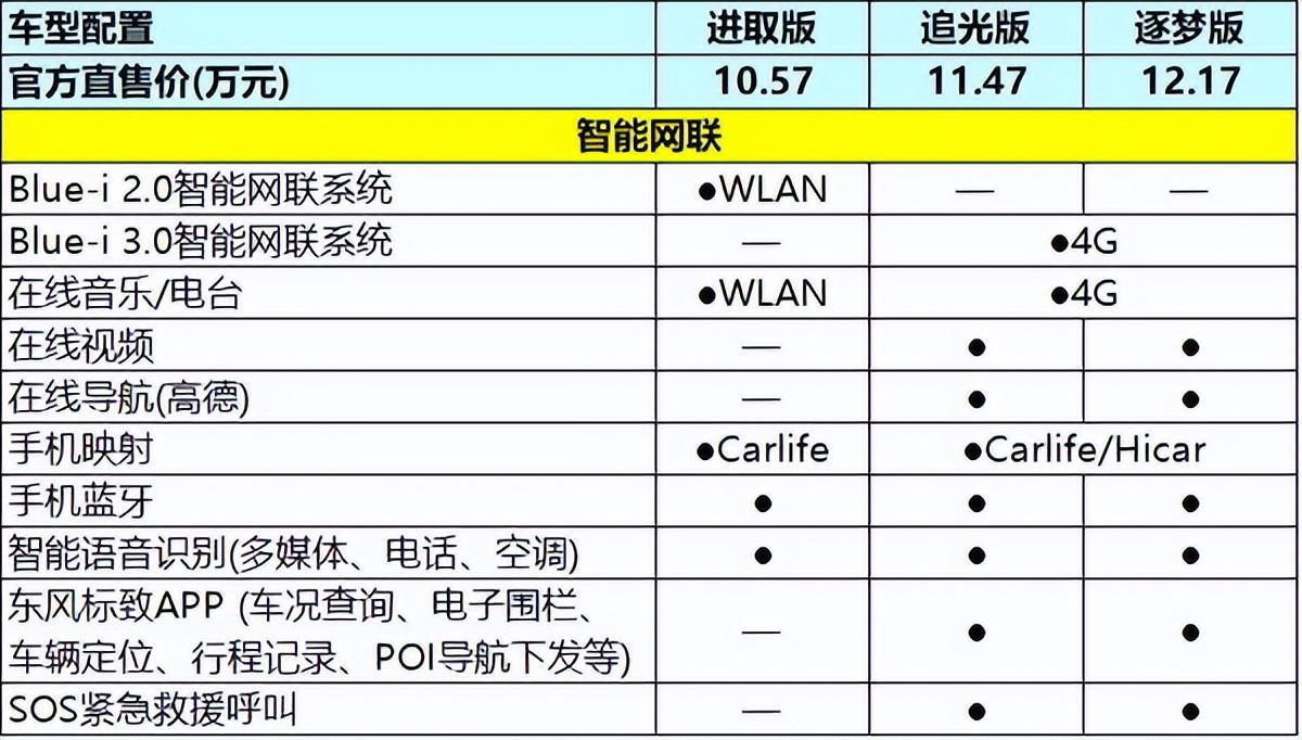 ② 追光版與逐夢版在此基礎上,增加/升級為Blue-i 3.0智能網(wǎng)聯(lián)系統(tǒng)(4G)、在線音樂/電臺(4G)、在線視頻、在線導航(高德)、手機映射(Carlife/Hicar)、東風標致APP (車況查詢、電子圍欄、車輛定位、行程記錄、POI導航下發(fā)等)、SOS緊急救援呼叫。