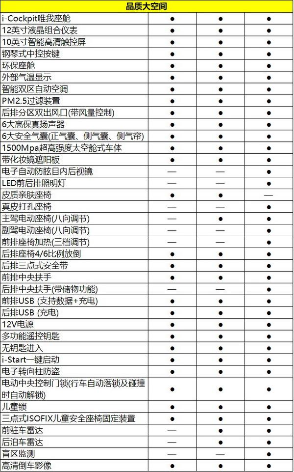 ① 進取版配備有i-Cockpit唯我座艙、12英寸液晶組合儀表、10英寸智能高清觸控屏、鋼琴式中控按鍵、環(huán)保座艙、外部氣溫顯示、智能雙區(qū)自動空調(diào)、PM2.5過濾裝置、后排分區(qū)雙出風口(帶風量控制)、6大高保真揚聲器、6大氣囊(正氣囊、側氣囊、側氣簾)、1500Mpa超高強度太空艙式車體、帶化妝鏡遮陽板、皮質親膚座椅、后排座椅4/6比例放倒、后排三點式帶、前排中央扶手、前排USB (支持數(shù)據(jù)+充電)、后排USB (充電)、12V電源、多功能遙控鑰匙、無鑰匙進入、i-Start一鍵啟動、電子轉向柱防盜、電動中央控制門鎖(行車自動落鎖及碰撞時自動解鎖)、兒童鎖、三點式ISOFIX兒童座椅固定裝置、高清倒車影像。