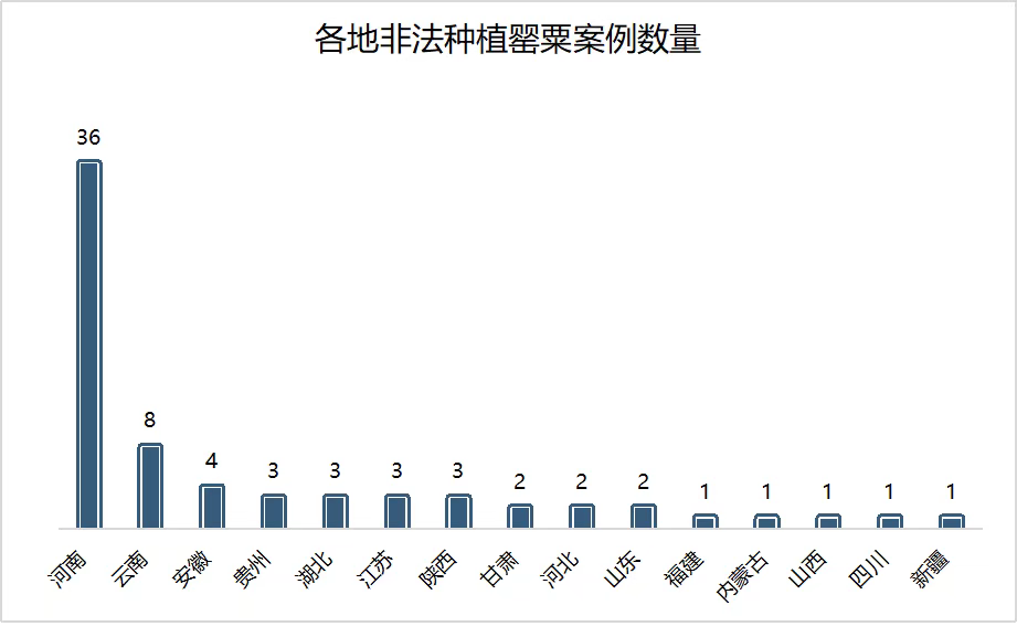 涉及非法種植的案例中,河南省數(shù)量多,有36個,其中該省下轄的唐河縣有14個。