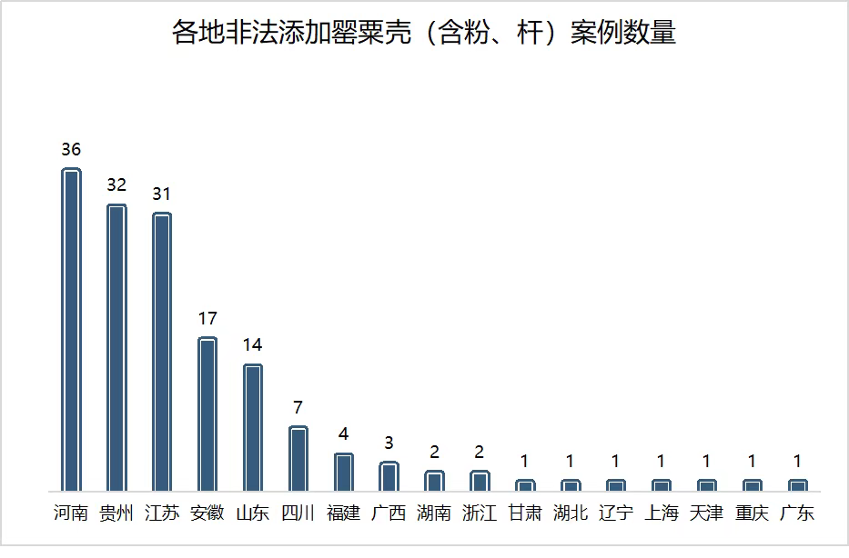 各地非法添加罌粟殼(含罌粟殼粉、罌粟桿)案例數(shù)量。數(shù)據(jù)來源:裁判文書網(wǎng)公布的2020年1月至2021年4月宣判案例