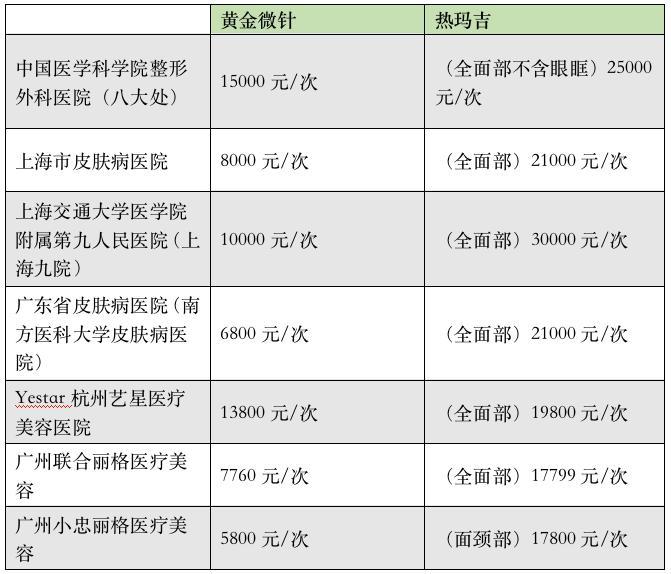 而熱瑪吉則相對簡單,因為其調(diào)節(jié)儀器單一,一般900發(fā)的價格在20000元以上,不同的醫(yī)療機(jī)構(gòu)有不同的定價。據(jù)21新健康記者調(diào)查目前市場上主流醫(yī)療機(jī)構(gòu)定價如下表。