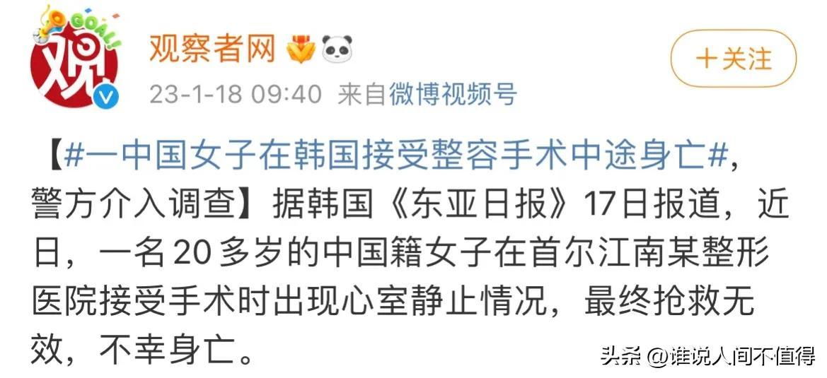 想寫這一話題,是因為今天在熱搜上看到了一則令人痛心的新聞:一名中國女子,在韓國接受整容手術(shù)中途身亡。