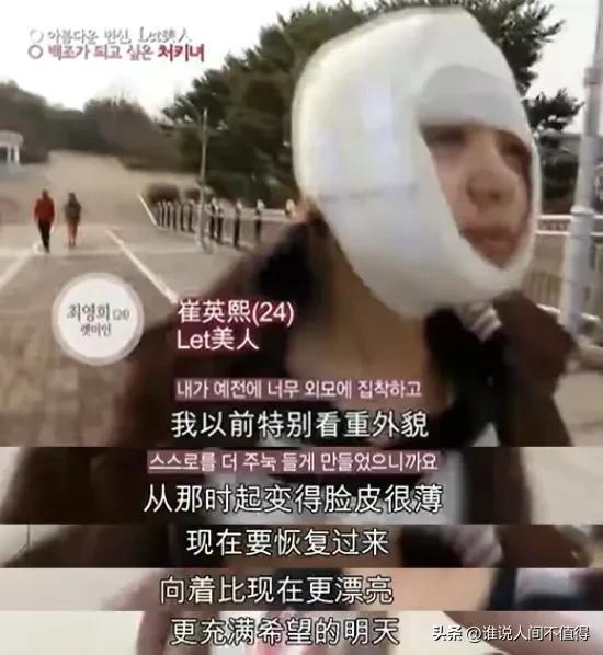 整容后,崔英熙的腦袋上纏著厚厚的紗布。她走在大街上接受采訪時,信心滿滿地表示“向著比現(xiàn)在更漂亮,更充滿希望的明天(努力)?!?/p>