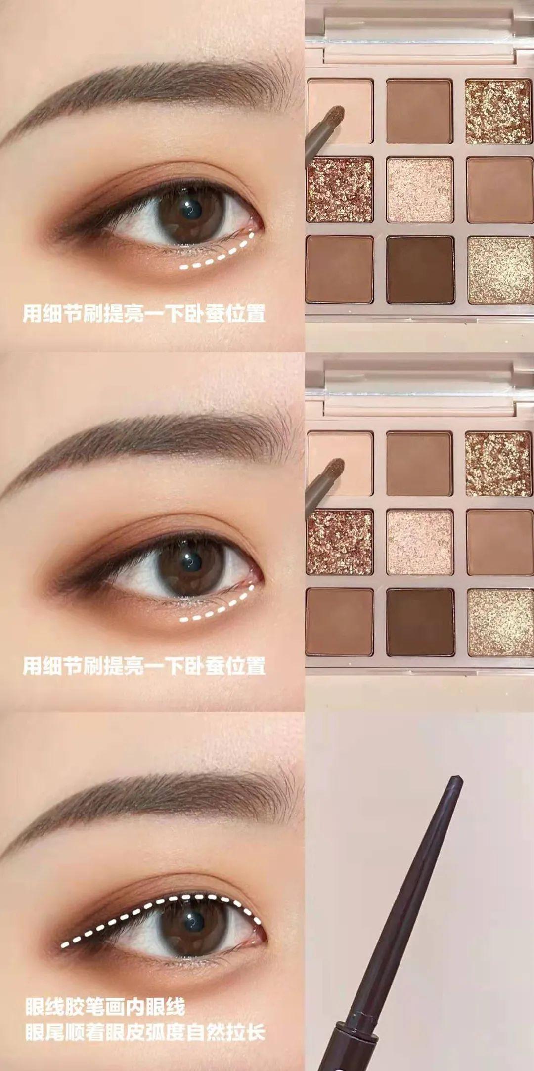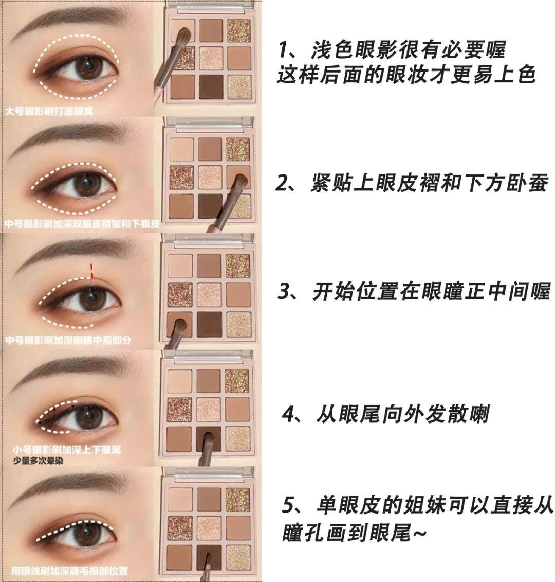 眼影選用奶茶大地色眼影真的消腫又日常,推薦姐妹們使用??!淺色系打底,奶咖色加深雙眼皮褶皺,大地色加深上下眼尾。