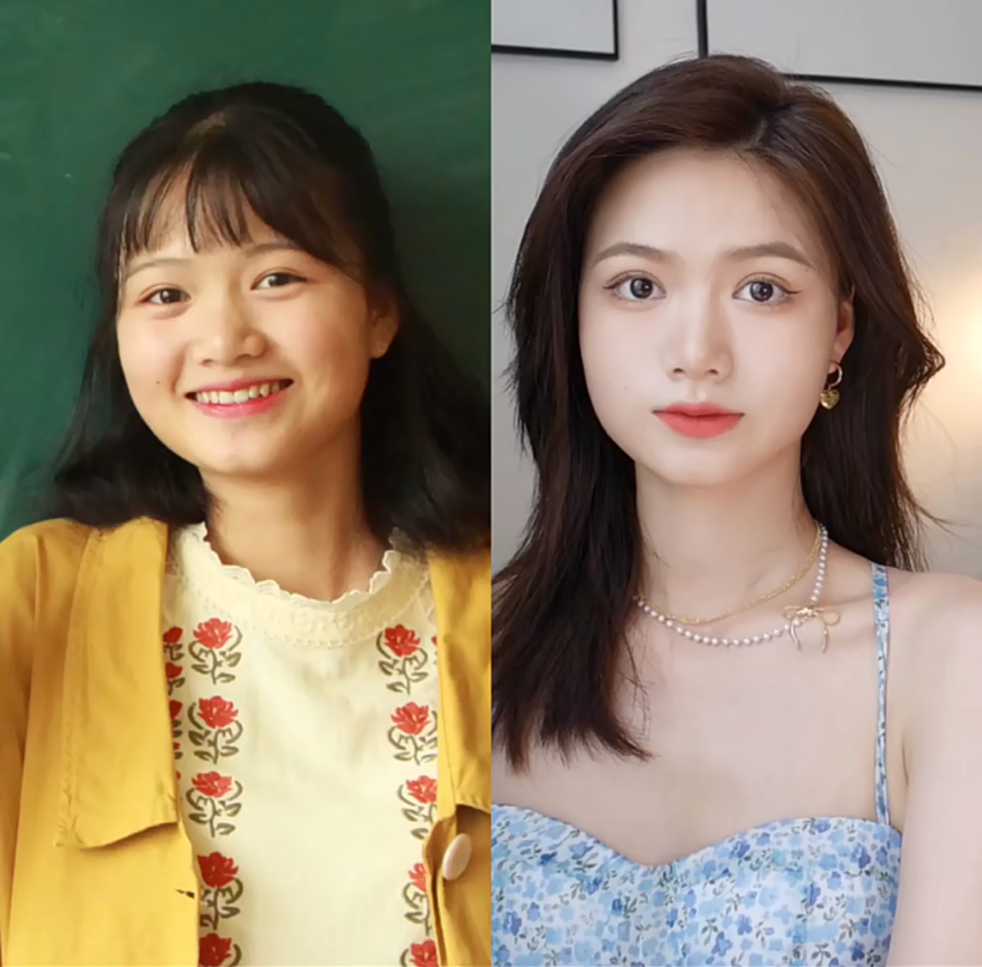 為了避免你們不相信她原先是五官硬傷很多的方圓臉,我先給你們看一下,她以前沒有找對(duì)適合自己的妝發(fā)的時(shí)候長這樣,是不是感覺憨憨的,還挺土氣?