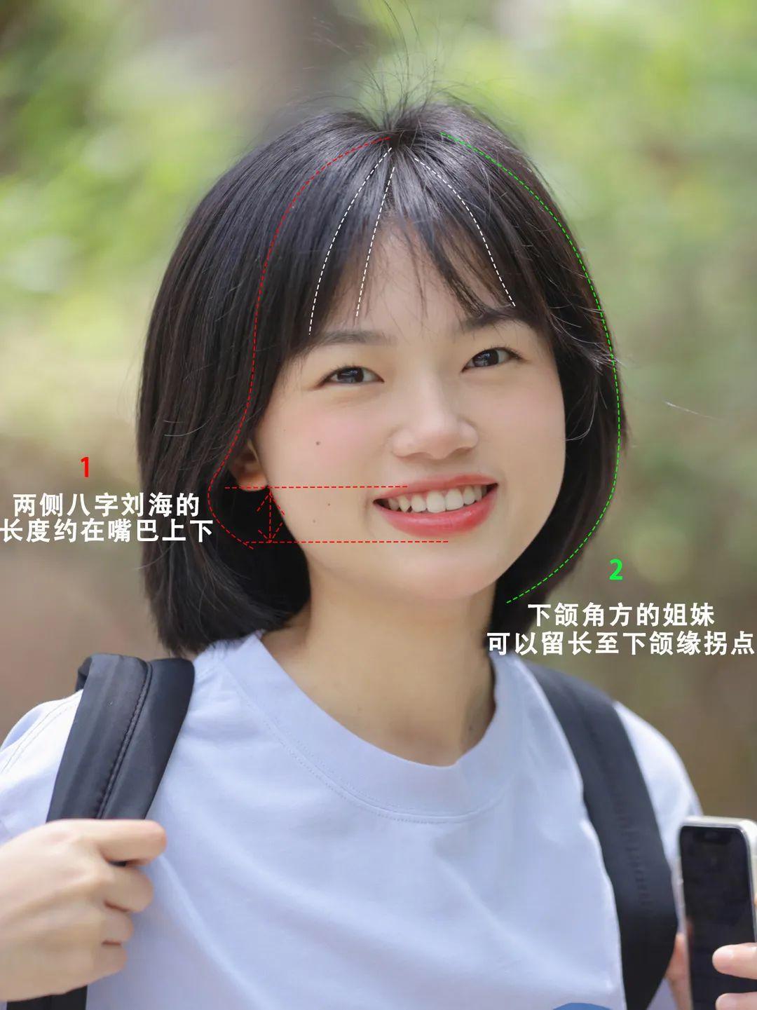 劉海長度上,剛洗完頭發(fā),空氣劉海沒吹沒卷的情況下,長度約在眼睛中間兩側(cè)的八字劉海要長于空氣劉海,長度在嘴巴部分,蓋過高顴骨。當(dāng)然如果姐妹下頜角方的話,可以再長一點(diǎn),遮住下頜線拐點(diǎn)為準(zhǔn)。