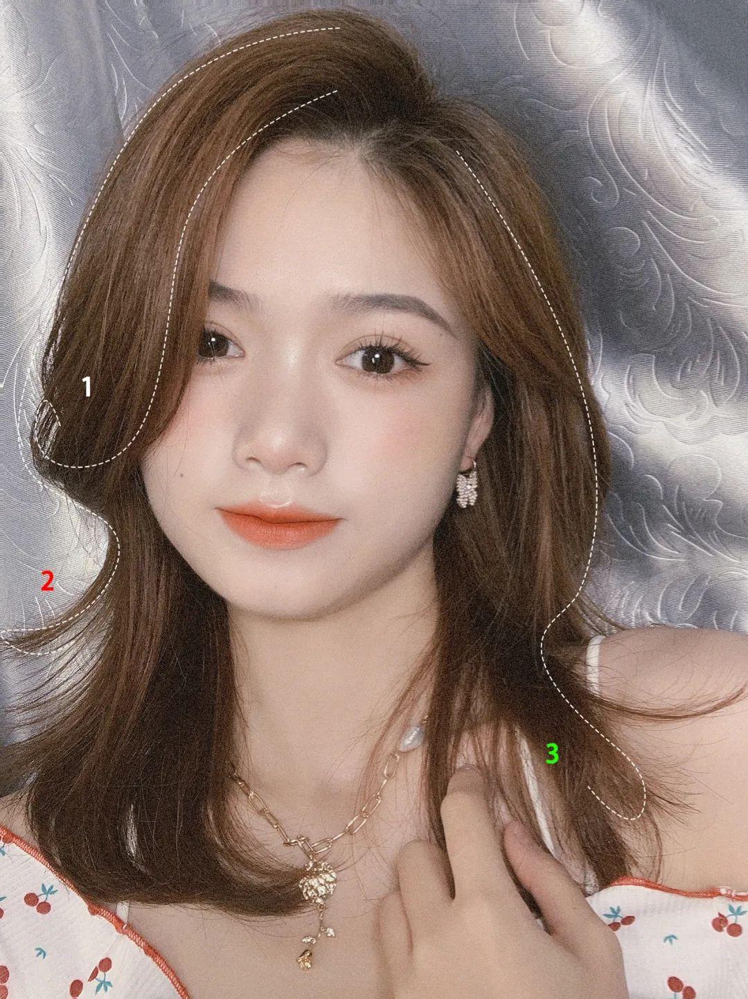 和日系元?dú)舛贪l(fā)一樣,高層次鎖骨卷發(fā)也分為3種層次,通過打造線條感,中和面部的鈍感,具體長度為①是側(cè)劉海部分,長度直接到下頜骨(哪里寬遮哪里);②在脖子中間;③在鎖骨下方3cm位置。