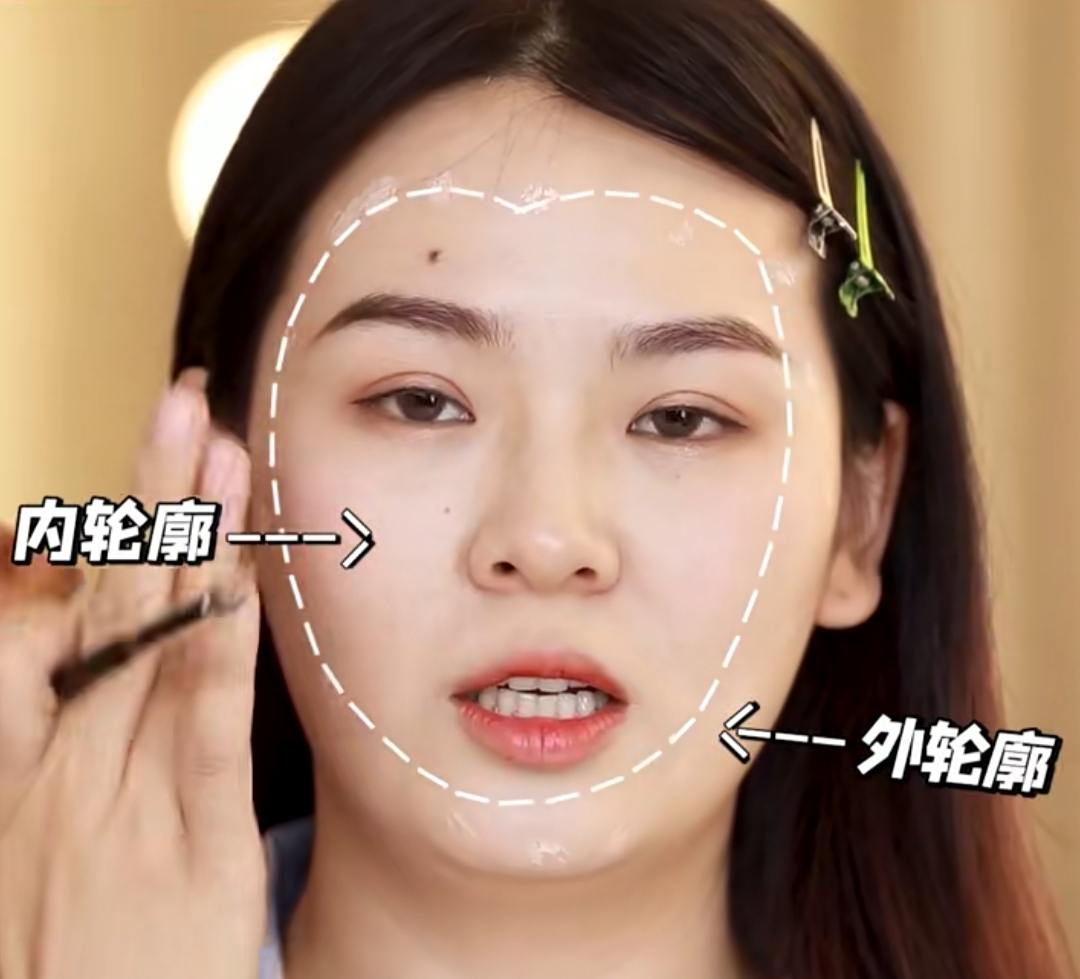 正式開始前,姐妹們需要對(duì)自己的臉部內(nèi)外輪廓進(jìn)行劃分,將自己的正面部分圈起來,大概會(huì)得出這樣一個(gè)心形區(qū)域。
