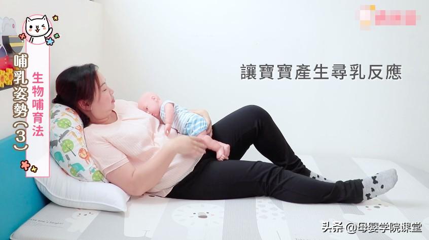 媽媽輕松斜倚在床上,寶寶放在媽媽身上,讓寶寶產(chǎn)生自然尋乳的行為。