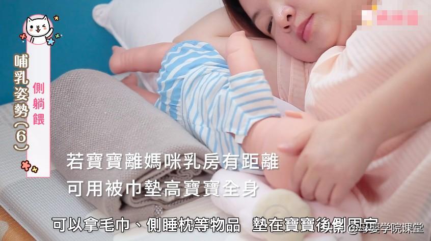在寶寶成功吸吮到母乳之后,可以拿毛巾、側(cè)睡枕等物品,墊在寶寶后側(cè)固定。