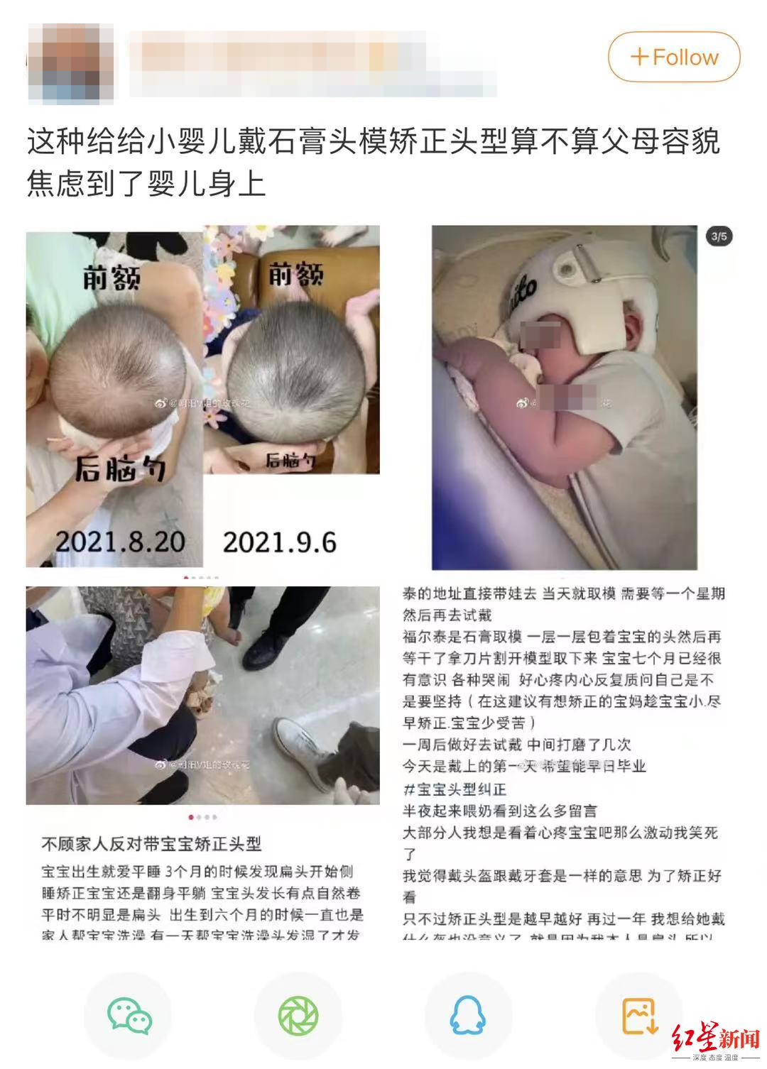 給娃戴矯正“頭盔”后出問題網友熱議中,不少人認為這樣簡直就是在讓孩子受罪。不過,也有一部分人對此表示理解。“跟孩子玩游戲,用腦袋頂東西,他能頂一本書,而我一低頭,感覺后腦勺可以頂個微波爐?!焙蜗壬嬖V記者,他小時候作為家里的男孩,被父母安排睡了整整六個月的綠豆枕頭,所以現在整個臉蛋看起來像一張大餅。“每次梳頭梳到后腦勺,頭發(fā)就趴起的。夏天戴棒球帽,后腦勺處還會癟下去一塊?!?/span>直到30多年后的今天,他還會追問母親這個事情。母親說,那個時候大家都給孩子睡平頭(扁頭),都覺得平頭好看。等有了自己的孩子,何先生則表示不想兒子跟自己一樣,可以“頂”起微波爐。他說早在妻子分娩前,就特意查了很多資料。孩子出生后,為了讓寶寶擁有的頭型,他甚至混跡各大“媽媽群”“母嬰群”,從中學到了很多擁有好頭型的辦法?!坝眠^定型枕,還戴過定型帽,幾十到幾百元的價位都試過,平時還注意讓孩子左右側著睡。”何先生說,定型帽其實就是一個棉布做的防護帽,防止孩子腦袋磕磕碰碰受傷,“如果是可行的,試一下又如何呢?”矯正機構:介紹稱年齡四到八個月是矯正黃金期每天戴23小時,一套2.8萬元記者發(fā)現,很多矯正頭型的視頻下方都有人“求推薦”,但博主表示自己并非醫(yī)院,只是專門做矯正的地方。頭型矯正“頭盔”到底是什么樣的?具體如何矯正,是不是何先生了解的那種呢?近日,記者找到了一家開設在成都的頭型矯正機構。“半歲寶寶右邊后腦勺突出、左邊后腦勺扁平,是否可以矯正?”記者以消費者的身份詢問工作人員。對方詢問了寶寶的一些基本情況,然后表示:“根據寶寶現在的月齡和頭型來看,是可以矯正的。戴‘頭盔’,大概需要三個月就能矯正?!?/span>頭型矯正“頭盔”的原理是什么?對方解釋,頭型矯正“頭盔”不是通過壓迫頭骨突出的地方去達到頭型對稱,而是會在頭顱突出的地方實現合適的接觸,再給寶寶頭部扁平的地方留出足夠的生長空間,引導頭部往扁平的地方生長。而且,寶寶頭型矯正好后不會再睡偏,孩子的頭型會按照矯正好的比例繼續(xù)生長。他表示,一般情況下,寶寶月齡越小,佩戴“頭盔”的時間越短,“四到八個月的孩子,是頭型矯正的一個黃金時間?!?/span>上述機構人員介紹,寶寶在佩戴“頭盔”時,“每天需佩戴23小時,還有1個小時的護理時間,晚上需要整晚佩戴睡覺?!惫ぷ魅藛T還介紹,一套矯正下來是2.8萬元,“頭盔”的重量大概200克,四個月以上寶寶的頸部是可以支撐這個重量的。頭盔外層材質是樹脂,內側是抗敏的泡沫。“戴‘頭盔’其實就像寶寶戴自己的帽子一樣,只不過會比帽子要厚一點?!惫ぷ魅藛T讓記者放寬心使用。