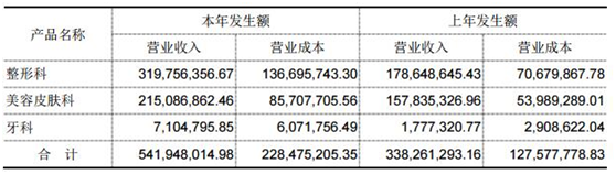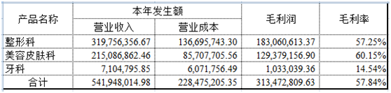 2016年度H整形醫(yī)院主營(yíng)業(yè)務(wù)綜合毛利率為57.84%,其中:整形毛利率為57.25%、美容皮膚毛利率為60.15%,而牙科毛利率僅有14.54%: