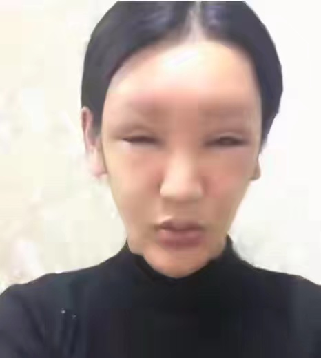 她的臥蠶出現(xiàn)的大小不一,下巴也嚴重凹陷變形,鼻子還變成歪鼻梁,嘴巴也疼痛地腫成了香腸嘴。