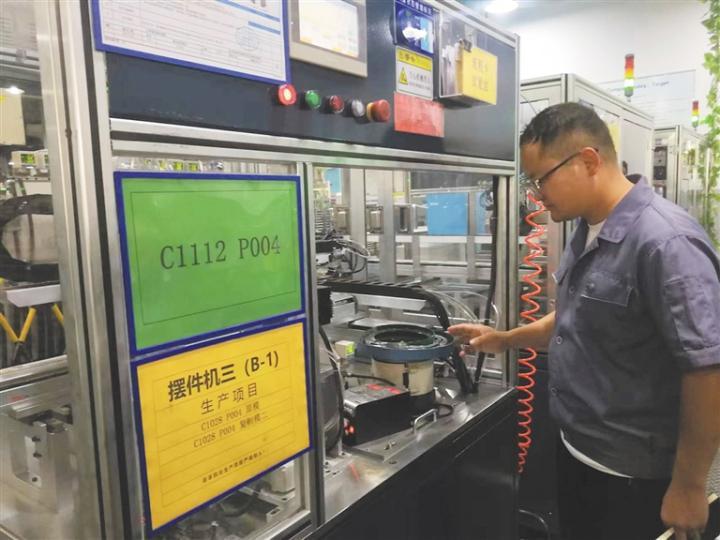 工作人員檢查全自動(dòng)擺件機(jī)。