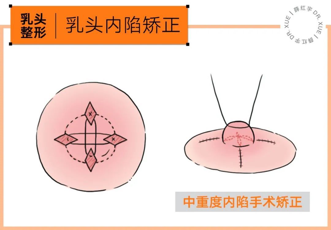 中重度乳頭內(nèi)陷則需要手術(shù)調(diào)節(jié)。如圖在乳頭四周的乳暈切除幾個(gè)菱形組織,深至皮下;用縫線將乳頭牽出、松解、皮下縫合,使乳頭挺立;后將菱形切口逐一縫合。