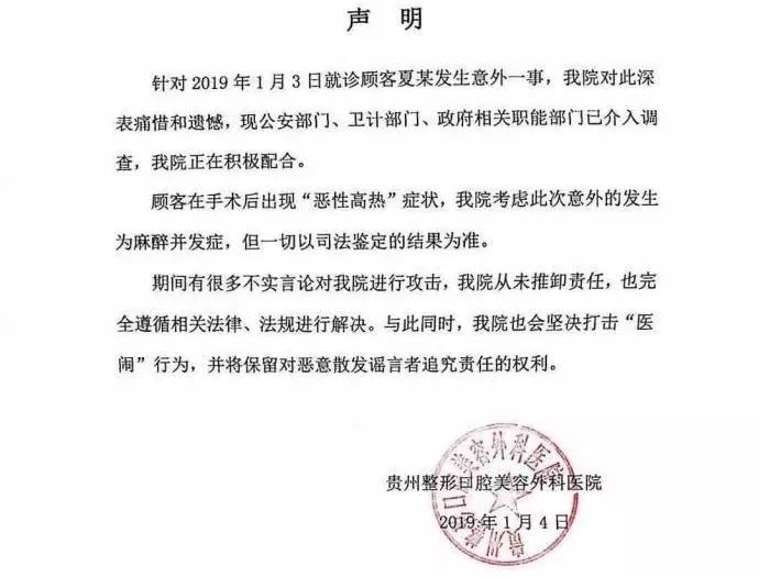 1月7日凌晨,貴陽(yáng)市云巖區(qū)衛(wèi)計(jì)局發(fā)布情況通報(bào)確認(rèn),患者夏某某實(shí)施的手術(shù)為“隆鼻術(shù),鼻延長(zhǎng)、雙側(cè)耳軟骨鼻尖綜合塑形”,執(zhí)刀醫(yī)生為利美康醫(yī)院外科門診主治醫(yī)師張某某。手術(shù)過(guò)程中夏某某出現(xiàn)四肢強(qiáng)直痙攣等情況,轉(zhuǎn)貴州醫(yī)科大學(xué)附屬醫(yī)院搶救無(wú)效死亡。
