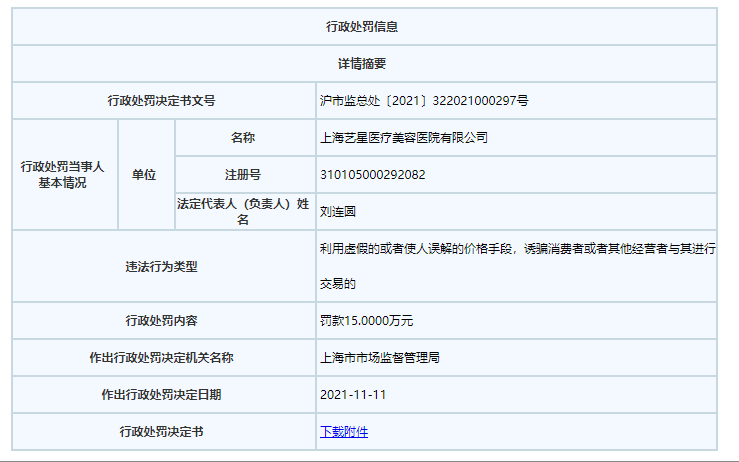 據(jù)一份11月11日上海市市場監(jiān)督管理局公布的行政處罰決定書顯示,上海藝星醫(yī)療美容醫(yī)院有限公司(以下簡稱”上海藝星”)因標(biāo)示虛假原價誘騙消費(fèi)者被罰15萬元。