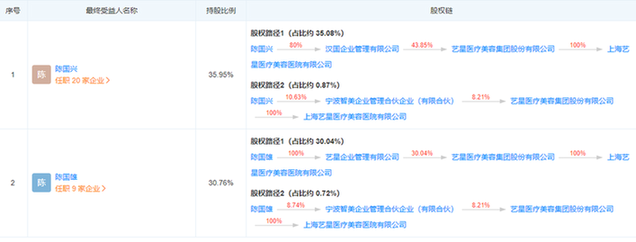 據(jù)悉,上海藝星是藝星醫(yī)療美容集團(tuán)股份有限公司全額子公司,終受益人陳國興持股35.95%,陳國雄持股30.76%,經(jīng)營范圍為外科,醫(yī)療美容科,麻醉科,醫(yī)學(xué)檢驗科,醫(yī)學(xué)影像科;健康信息咨詢(不得從事心理咨詢)等。另據(jù)上海藝星官網(wǎng)介紹,“藝星系”在北京、上海、杭州、武漢、成都等全國18地均設(shè)有分公司。(記者楊奇奇)