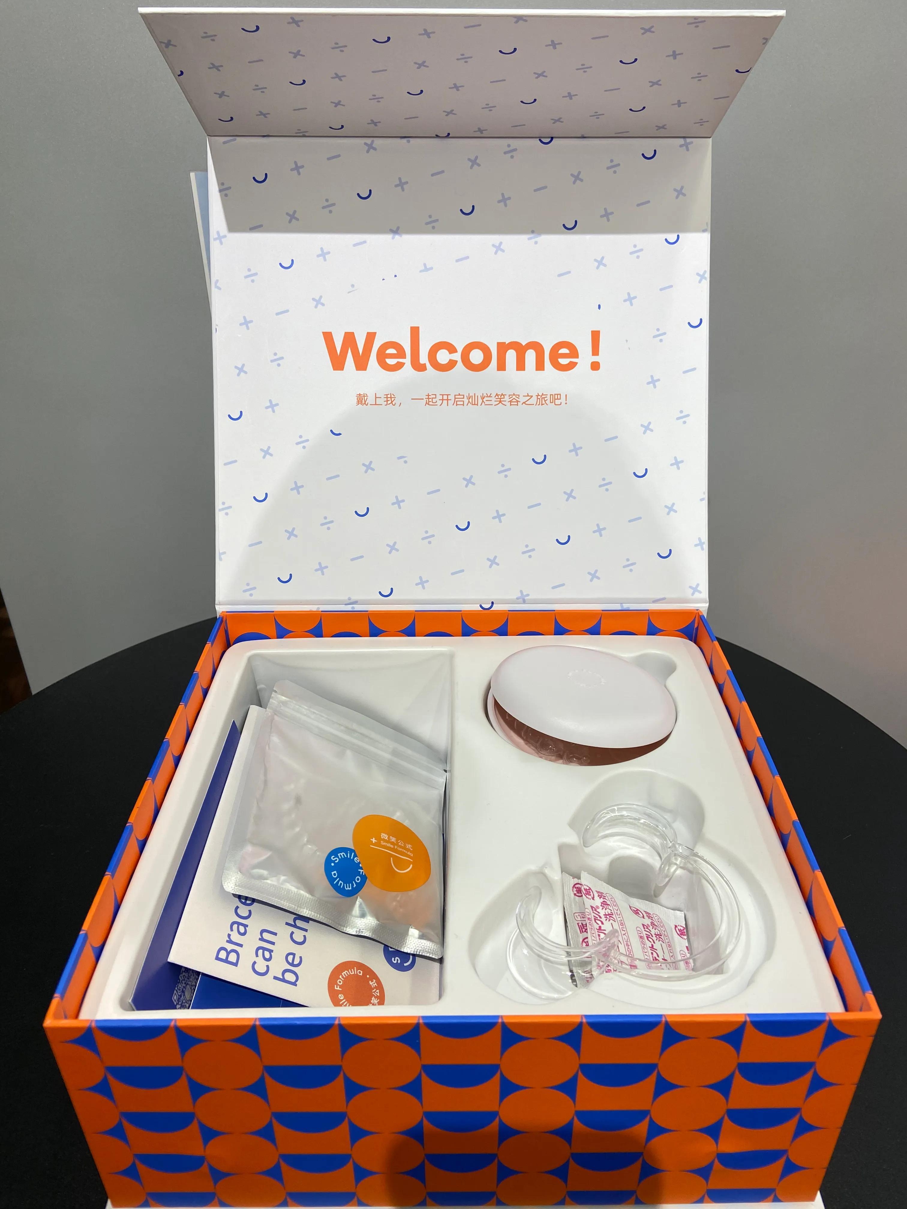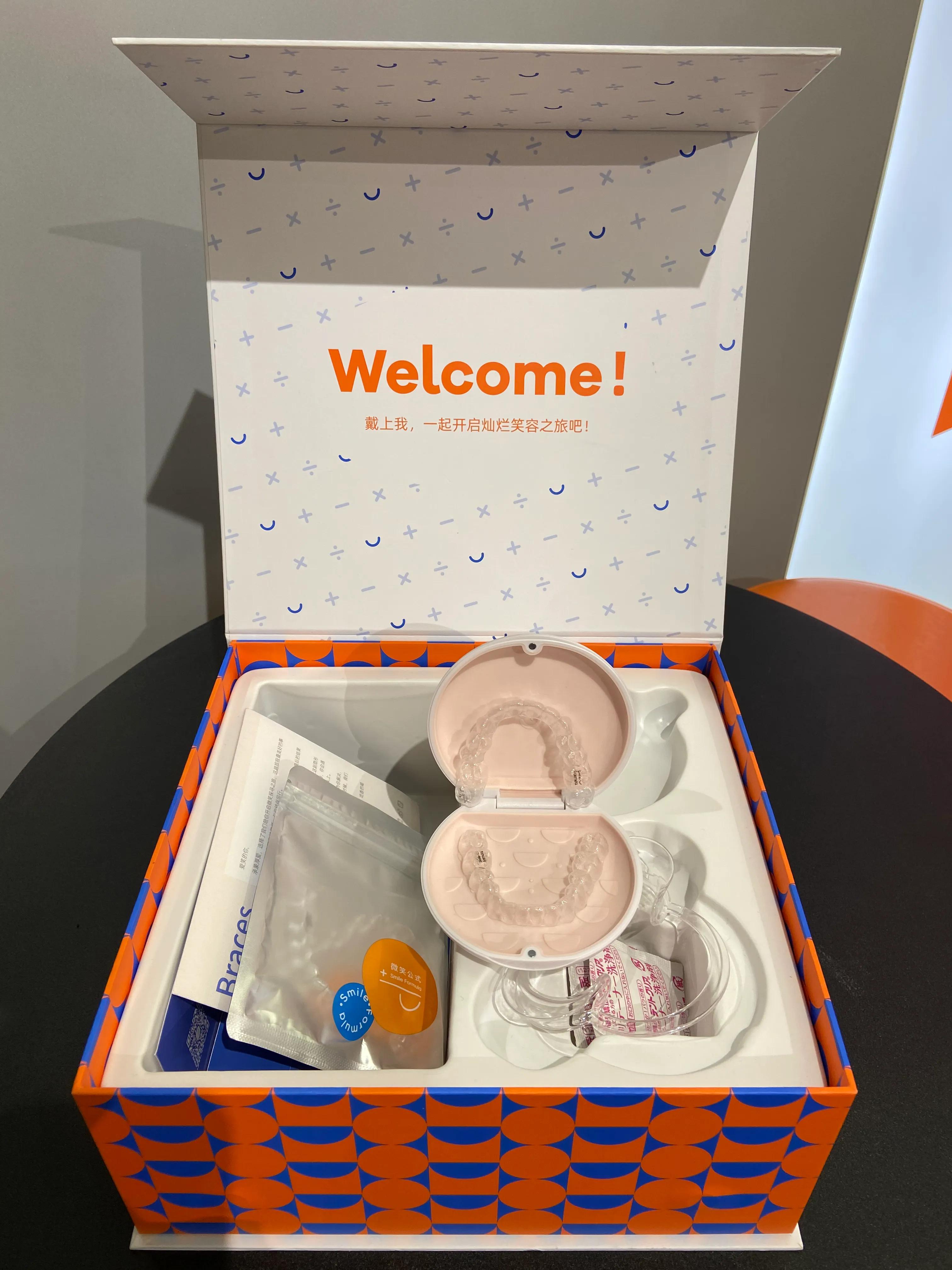 寄送到家的禮盒包裝很精美,有隱形牙套、牙套盒、清潔片、咬膠、開口器等配套用品,攜帶方便哦。還另外送了美牙筆和清潔泡沫!