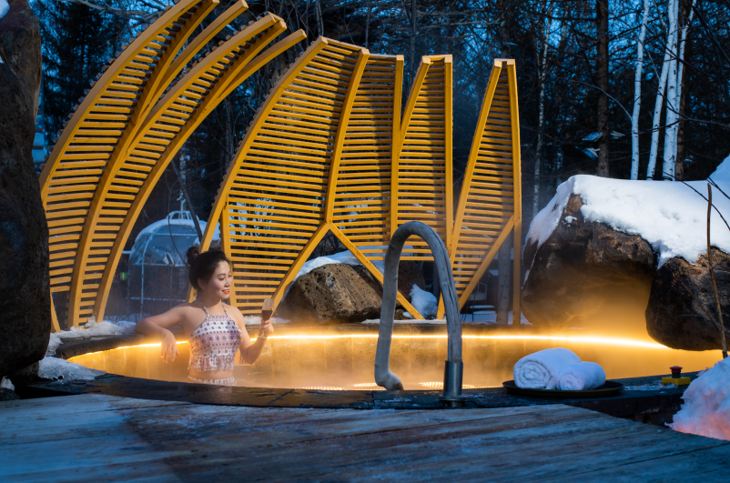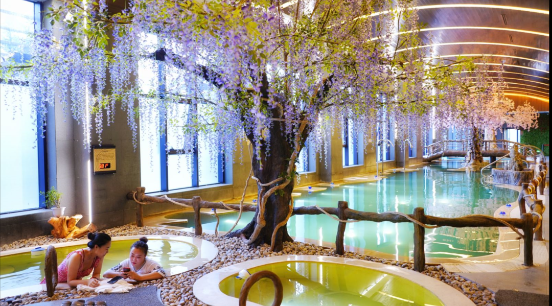 浴區(qū)內(nèi)包含長白山特色草藥浴、紅酒浴、咖啡浴、親親魚療池、園林景觀式湯池、森林木桶浴池、兒童嬉水池及多功能水療區(qū)。