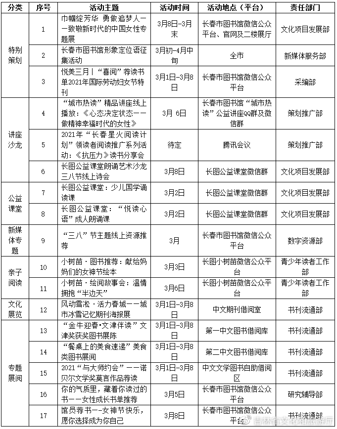 特別策劃“巾幗綻芳華 勇做追夢人——致敬新時代的中國女性專題展”;面向全市,還推出了為長春市圖書館征集文化形象定位語等活動。詳情如下: