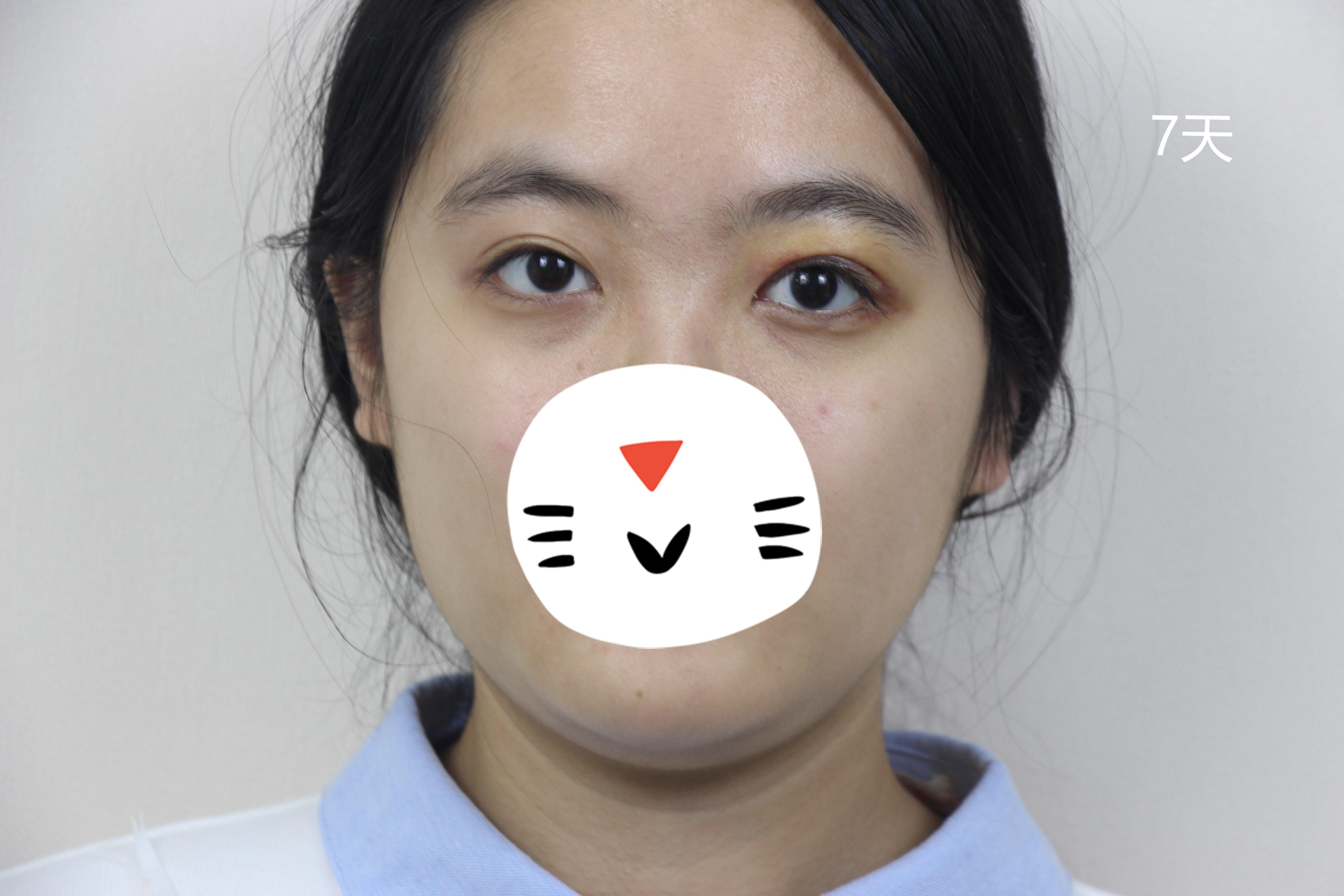 術(shù)后7天,小姑娘恢復得還是比較快的,7天拆線的時候已經(jīng)消腫很多了,雙眼皮流暢度也好看了,雙眼的大小也慢慢接近了。