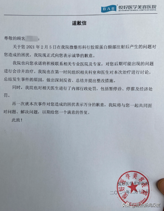 對此,四川悅好醫(yī)學(xué)美容醫(yī)院一名負(fù)責(zé)人告訴記者,事情發(fā)生后,院方高度重視,并就整個(gè)事情進(jìn)行了深入調(diào)查,還曾兩次出具道歉信。