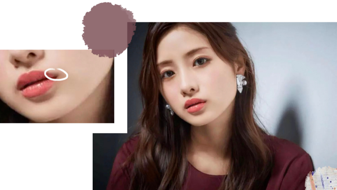 ▲ 模糊唇線,唇峰變得圓潤,咬唇妝把嘴唇量感變小也起到了很大的修飾作用。質(zhì)地上不要使用鏡面這種亮嘟嘟的效果更佳哦~