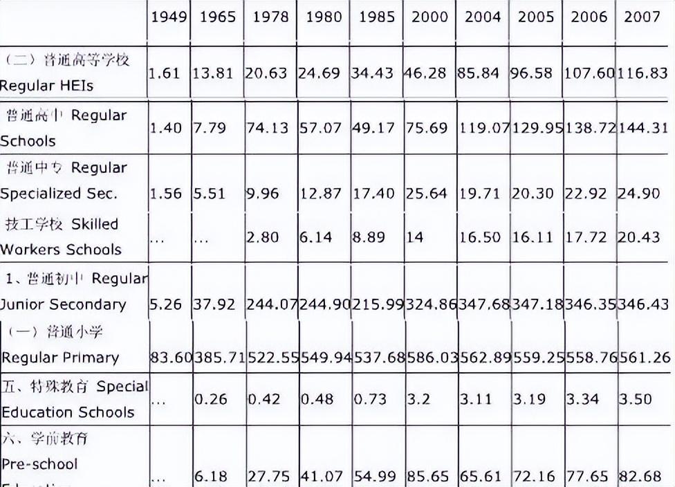 上表顯示1949-1980年招生377.5萬人,畢業(yè)268.4萬人,淘汰率29%,1981-1985年招生97.4萬人,畢業(yè)89.4萬人,淘汰率8%,改革開放前三十年近三成學(xué)生未能畢業(yè)。