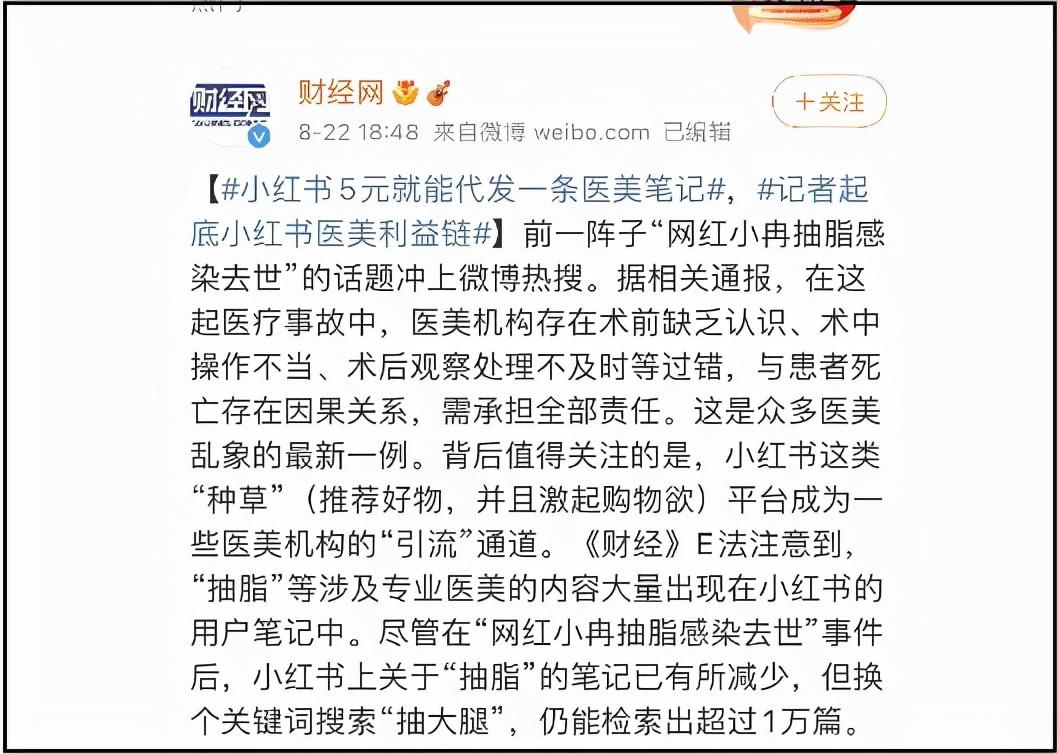 網(wǎng)紅小冉事件曝光后,《新京報(bào)》揭露,小紅書里大量的“醫(yī)美體驗(yàn)帖”,都是營(yíng)銷團(tuán)隊(duì)雇寫手杜撰出來(lái)的,一條帖5塊錢,老練寫手只需要5分鐘就能成稿。