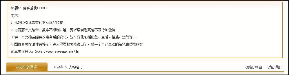 但在“中國(guó)賞金寫手”網(wǎng)站上,仍能找到醫(yī)美類寫手的招聘。有意思的是,這里的寫手需要比稿,中標(biāo)的才能拿到錢。比如,一則“微商隆鼻整容軟文寫作”任務(wù),要求以“隆鼻后我xxx”為開頭,需要10個(gè)稿件,每個(gè)中標(biāo)有16 元賞金。
