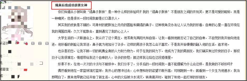 下面的7個(gè)應(yīng)聘稿件,基本上都講了隆鼻之后,女孩人生直接開掛,從標(biāo)題上就能看出來(lái),“隆鼻后我成功逆襲女神”、“隆鼻后我不再憂郁”等等。