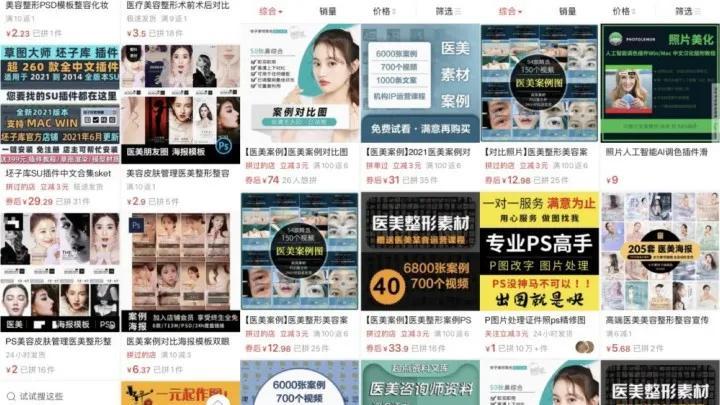 我在某多多上輸入“醫(yī)美案例”,發(fā)現(xiàn)貴74元,可以買到50張“”整形前后對(duì)比圖;便宜的只要34元,就可以買到6000張整容前后照片、700個(gè)視頻、1000條文案。