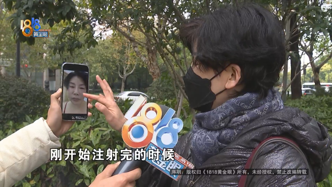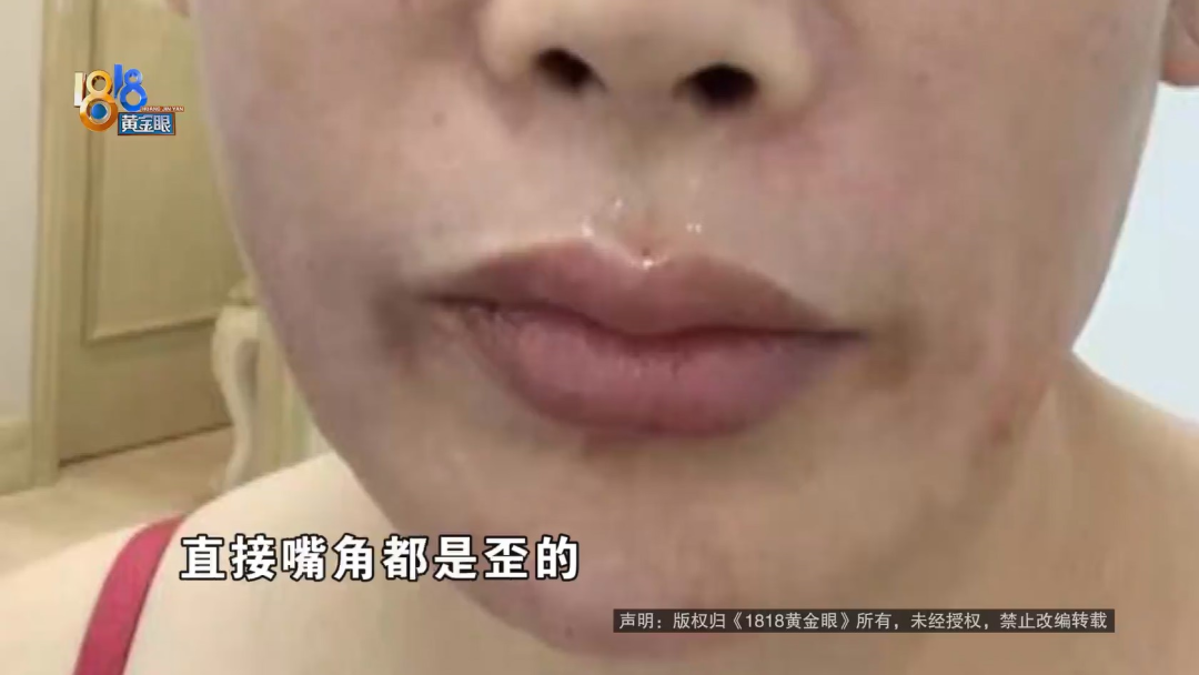 趙女士:這個(gè)是10月10號(hào),在維多利亞,經(jīng)過“吉娜”給推薦的。我做的是眉弓注射、臥蠶注射、嘴周的改良,還有微笑唇,但是做出來(lái),這就是在手術(shù)室剛開始注射完的時(shí)候我拍的照片。當(dāng)天只是覺得腫脹,沒覺得什么問題,上完冷敷之后,我再一看這個(gè)臉,臥蠶根本沒做一樣