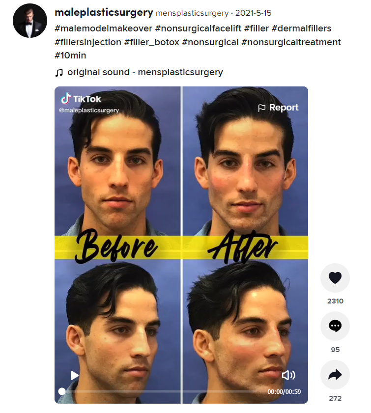 Steiger說,在疫情前,他的客戶中只有10%是男性,但疫情封鎖結(jié)束后,在做整形手術(shù)的人群整體都在增加的情況下,有25%的男性來做整形手術(shù),平均年齡在37歲。越來越多的中年男性會到整形機構(gòu)咨詢,他們會更在意自己的男性外觀,比如緊致光滑的脖子,和更加骨感的下巴。