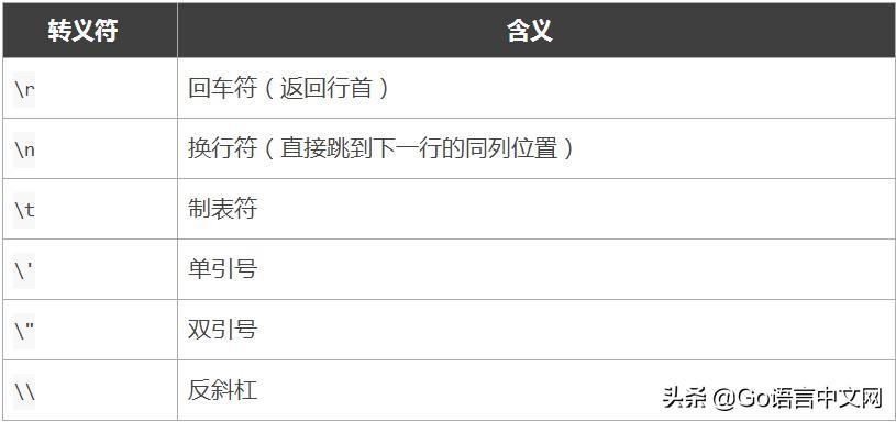 Go 語言的字符串常見轉(zhuǎn)義符包含回車、換行、單雙引號、制表符等,如下表所示。