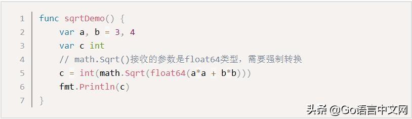 比如計算直角三角形的斜邊長時使用math包的Sqrt()函數(shù),該函數(shù)接收的是float64類型的參數(shù),而變量a和b都是int類型的,這個時候就需要將a和b強制類型轉(zhuǎn)換為float64類型。