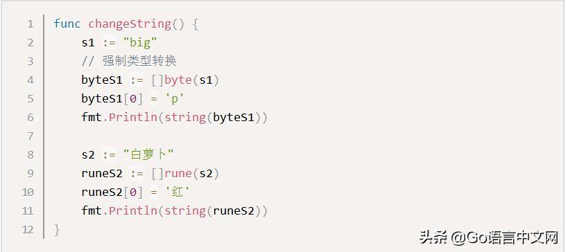 要修改字符串,需要先將其轉(zhuǎn)換成[]rune或[]byte,完成后再轉(zhuǎn)換為string。無論哪種轉(zhuǎn)換,都會重新分配內(nèi)存,并復(fù)制字節(jié)數(shù)組。