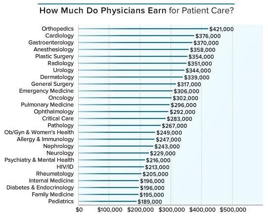 前三名為骨科(421,000美元),心臟科醫(yī)生(376,000美元)和胃腸病醫(yī)生(370,000美元)。低收入者為兒科(189,000美元),家庭醫(yī)生(195,000美元),內(nèi)分泌科和內(nèi)科醫(yī)生(均為196,000美元)。