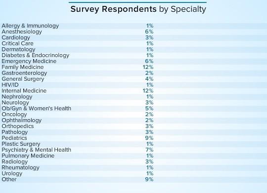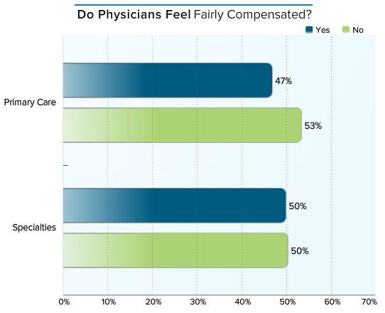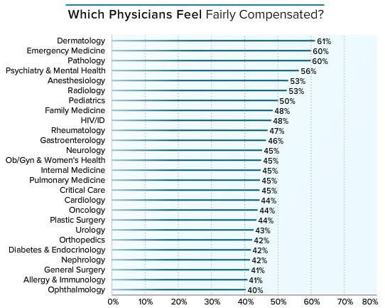 不滿意薪酬的科室為眼科(40%),過(guò)敏癥??坪推胀ㄍ饪漆t(yī)生(41%)。滿意其收入的是皮膚科(61%)、急診科和病理科醫(yī)生(60%)。后兩個(gè)科室的醫(yī)生今年薪酬增長(zhǎng)了12%。