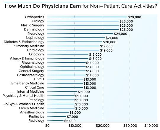 這些活動(dòng)包括專家鑒定,產(chǎn)品銷售,演講等。骨科依然高(29,000美元),依次是泌尿外科、整形外科和皮膚科(26,000美元)。收入少的為放射科(6000美元),兒科(7000美元)和麻醉科醫(yī)生(8000美元)。