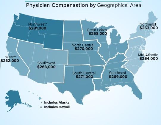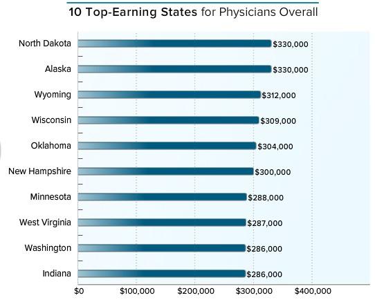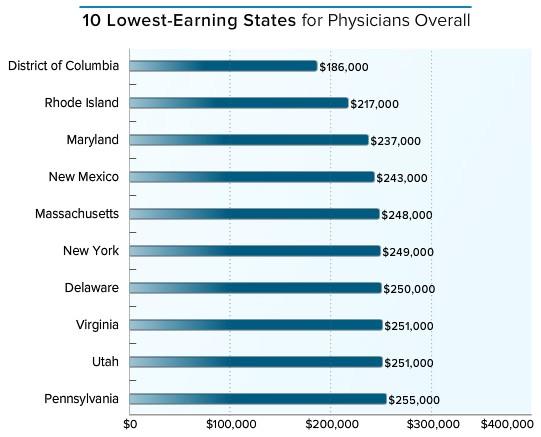 薪酬低的州是哥倫比亞、羅得島州和馬里蘭州,都位于東海岸,這些地方非醫(yī)生行業(yè)的收入都高于其他地區(qū)。