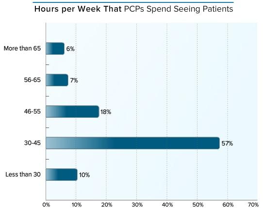 大多數(shù)(57%)初級(jí)保健醫(yī)生每周花30-45小時(shí)看病人。JAMA上一項(xiàng)研究對(duì)所有醫(yī)生的調(diào)查發(fā)現(xiàn),1997年到2007年間,看病人時(shí)間下降了近4個(gè)小時(shí)。