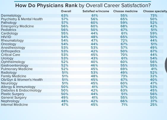 除了對(duì)薪酬滿意度外,此次調(diào)查還詢問(wèn)了醫(yī)生是否會(huì)再次選擇醫(yī)學(xué)以及同一個(gè)專科。根據(jù)計(jì)算,滿意的醫(yī)生為皮膚科醫(yī)生(63%),其次是病理科和精神科(57%)。滿意度低的是內(nèi)科醫(yī)生(47%),然后是腎病科和普通外科(48%和49%)。