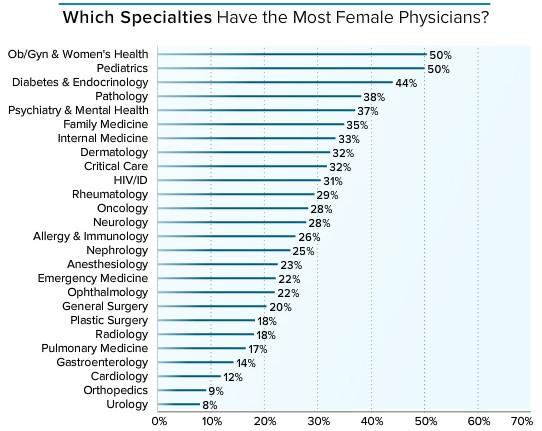 婦產(chǎn)科和兒科有一半醫(yī)生為女性。家庭醫(yī)生和內(nèi)科大約有三分之一是女性。實(shí)際上,女醫(yī)生仍然傾向于選擇非外科,女醫(yī)生少的科室為泌尿外科、骨科和心臟科。