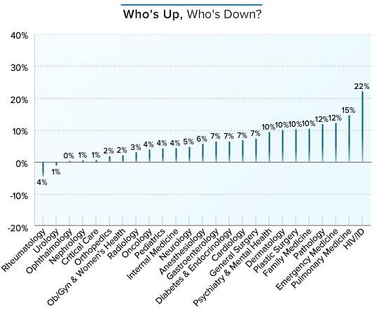 與前一年相比,只有風(fēng)濕科醫(yī)生的收入大幅下降(4%)。另外一個(gè)略微下降的科室是泌尿外科,不過(guò)只有1%。其余科室醫(yī)生都有增加,大的增長(zhǎng)出現(xiàn)在感染科(22%),其次是肺病科(15%),急診科和病理科(均為12%)。