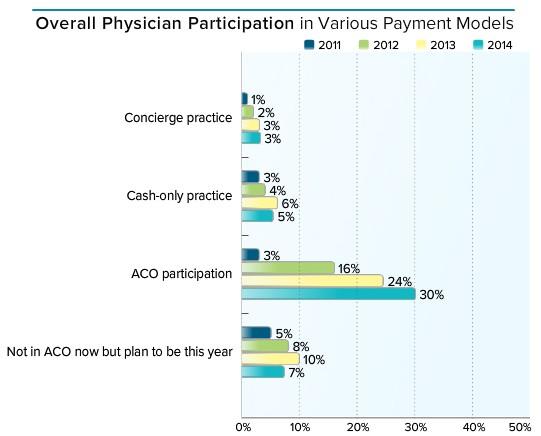 只支付現(xiàn)金(5%)和特約醫(yī)療模式(4%)的參與率與整體類似。相比于整體情況(37%),更多的PCP正在或期望加入責(zé)任醫(yī)療組織(ACO)(43%)。