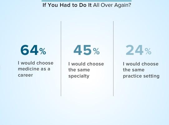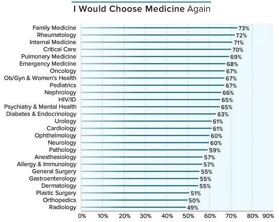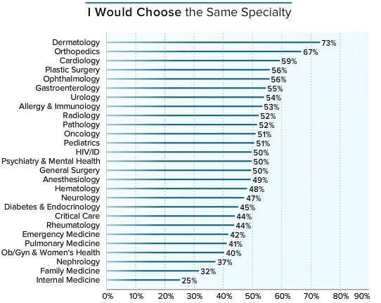 盡管只有55%皮膚科醫(yī)生說(shuō)還會(huì)選擇醫(yī)學(xué),但是如果選擇醫(yī)學(xué),有73%還會(huì)選擇同樣的專業(yè)。只有25%內(nèi)科醫(yī)生和32%家庭醫(yī)生會(huì)再次選擇初級(jí)保健醫(yī)生。