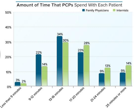 56%家庭醫(yī)生和44%內(nèi)科醫(yī)生看每個(gè)病人花費(fèi)9-16分鐘。